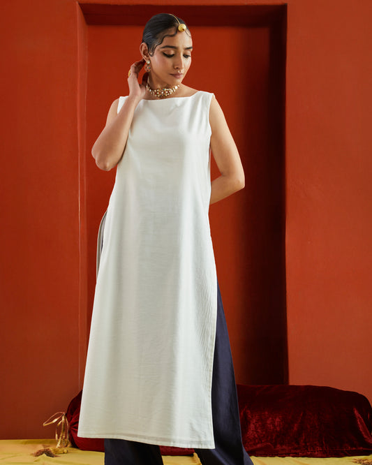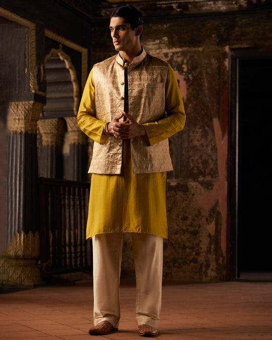 Off white Pure Chanderi Kurta With Gold Piping On Hidden Placket