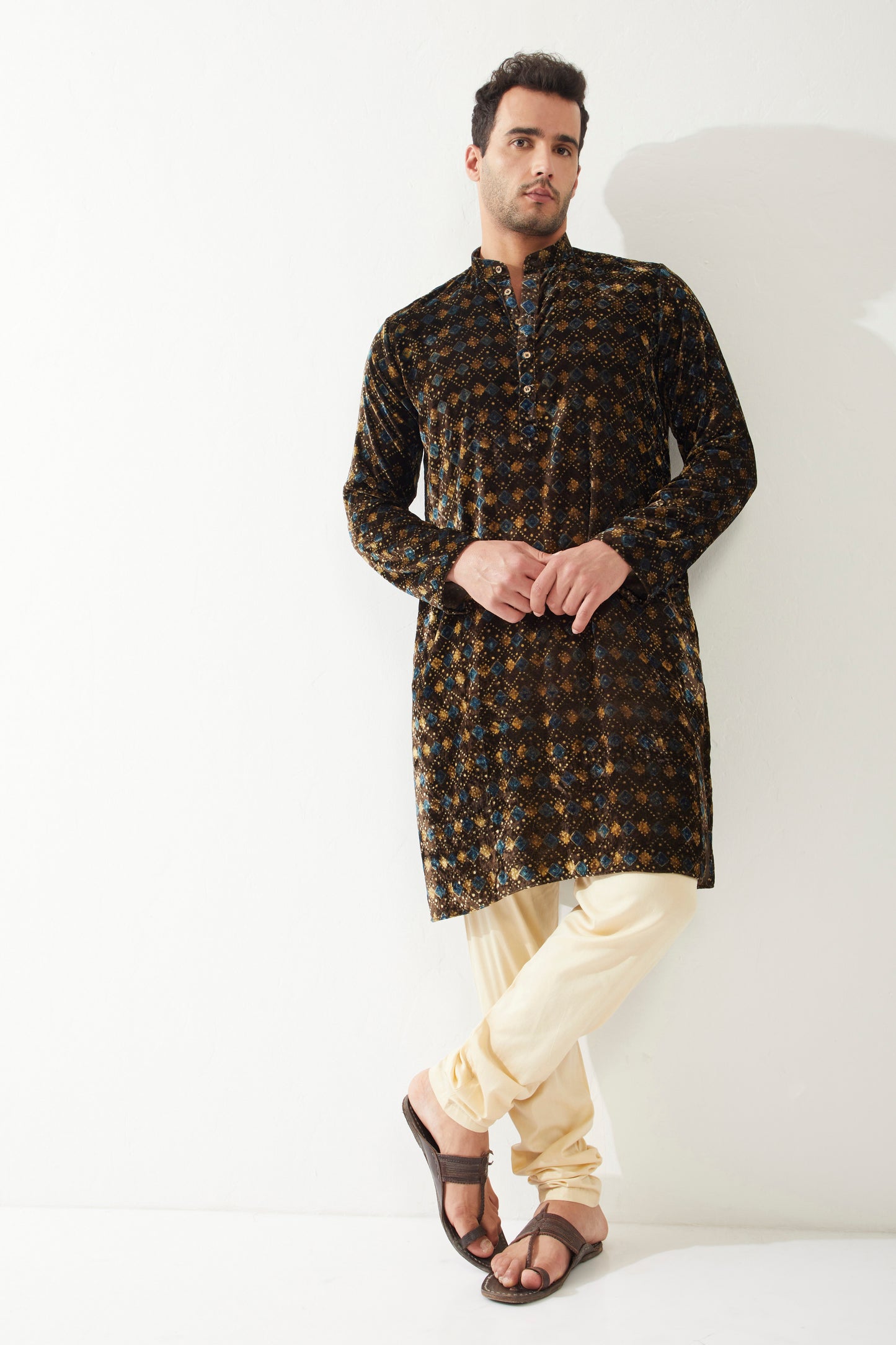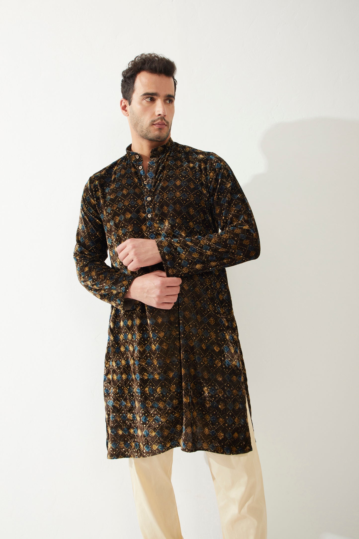 Product Description: Full-sleeve long kurta with a mandarin collar and pockets, made with handcrafted Velvet Ajrakh.