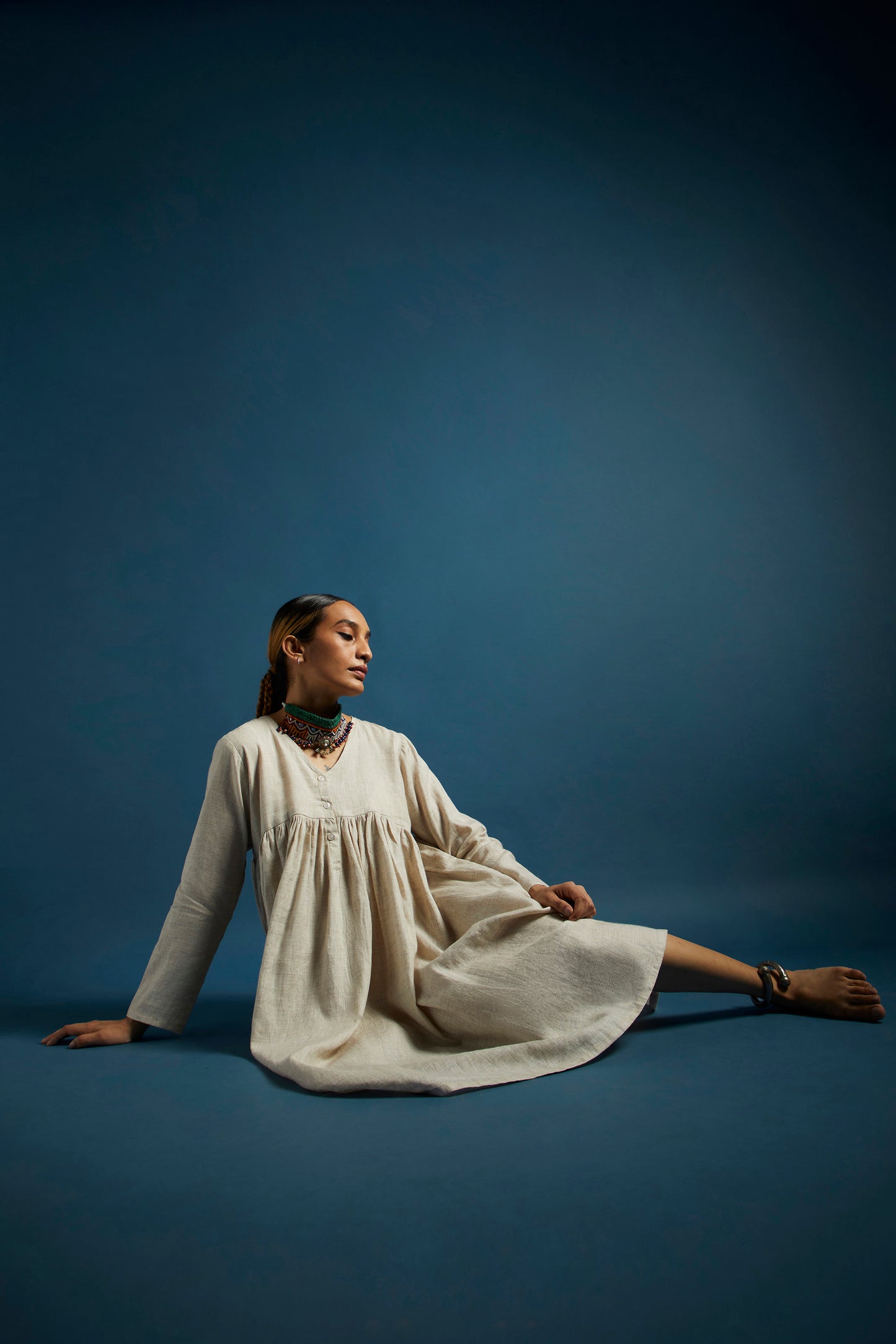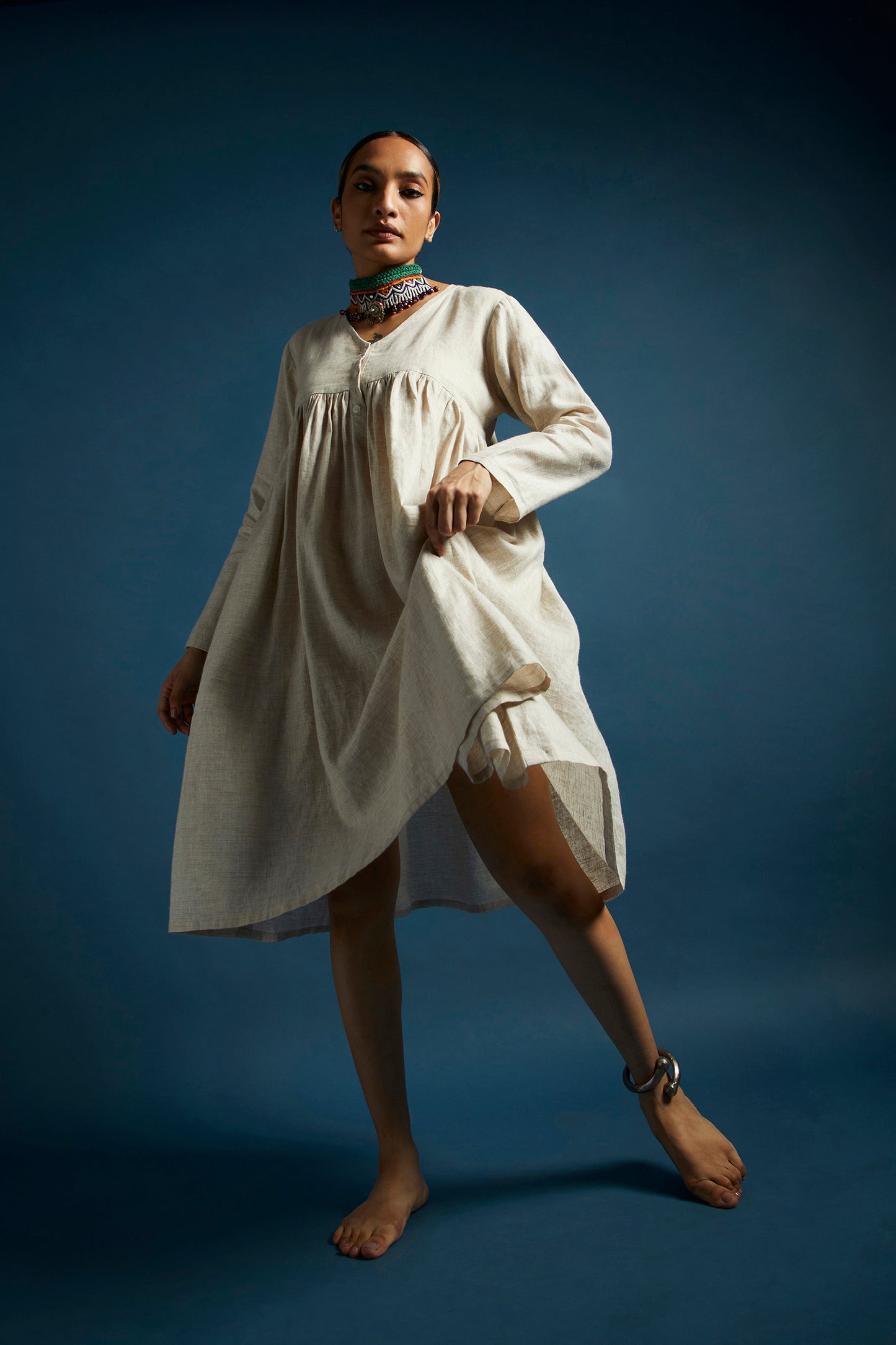 Product Description: Full sleeve linen midi dress with a V neckline and buttons.