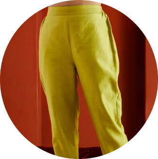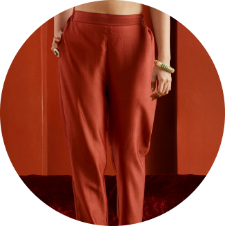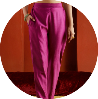 Chanderi pants with pockets, tapered along length, elastic at the back and belt in front.