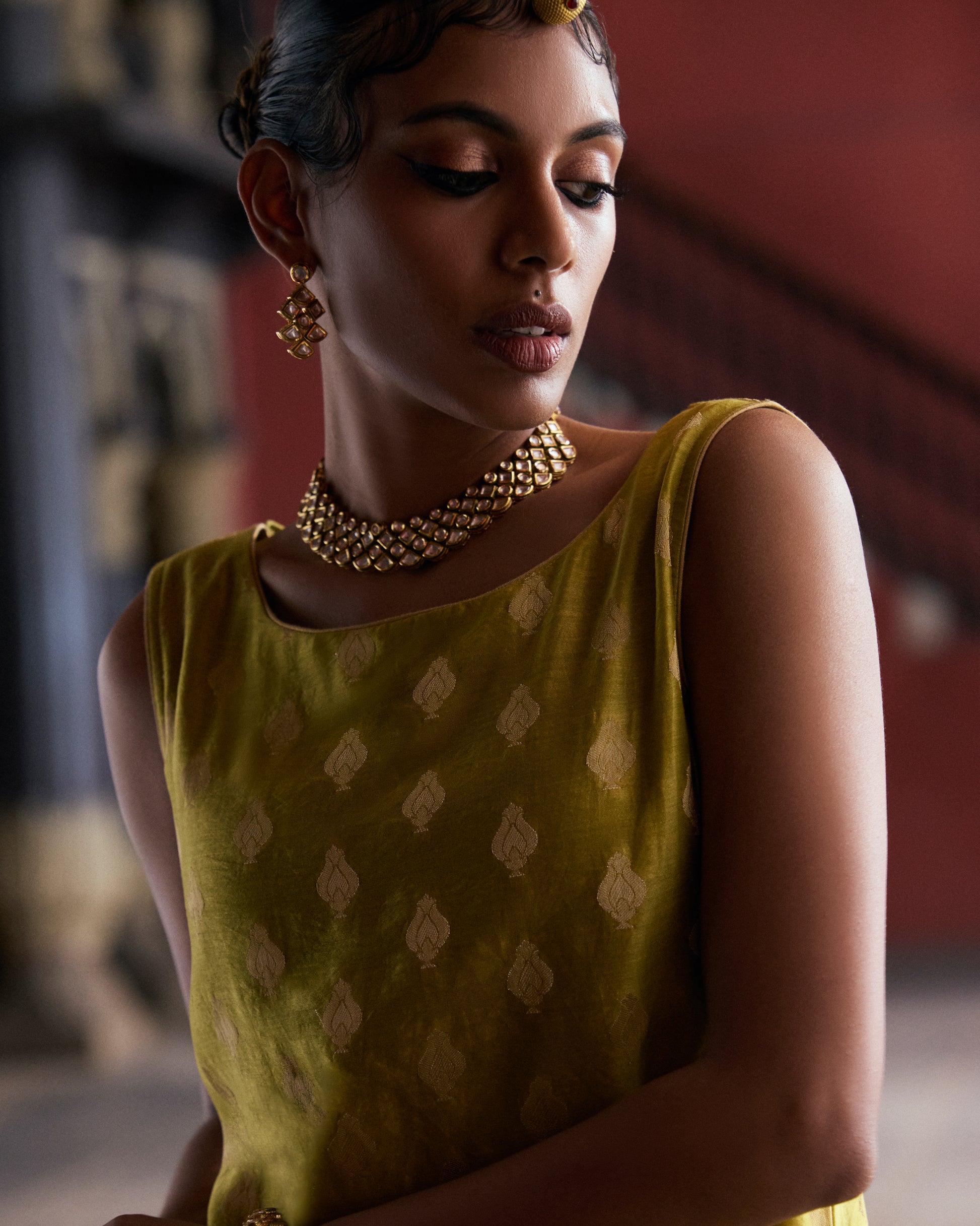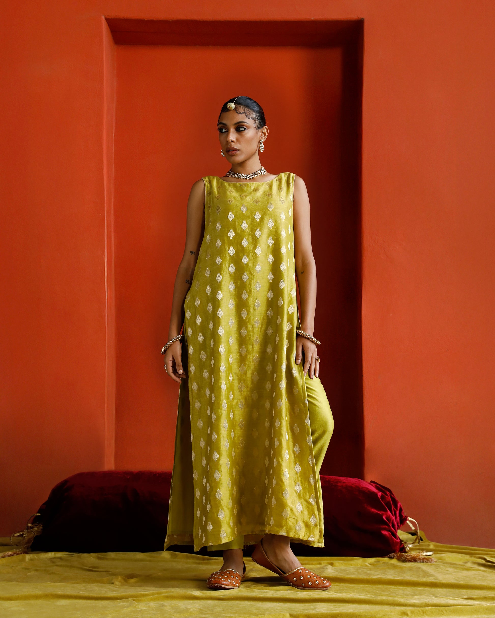 Chanderi Tulip Zari Buta Kurta with boatneck and gold piping detail on neckline and arms, with cotton lining.