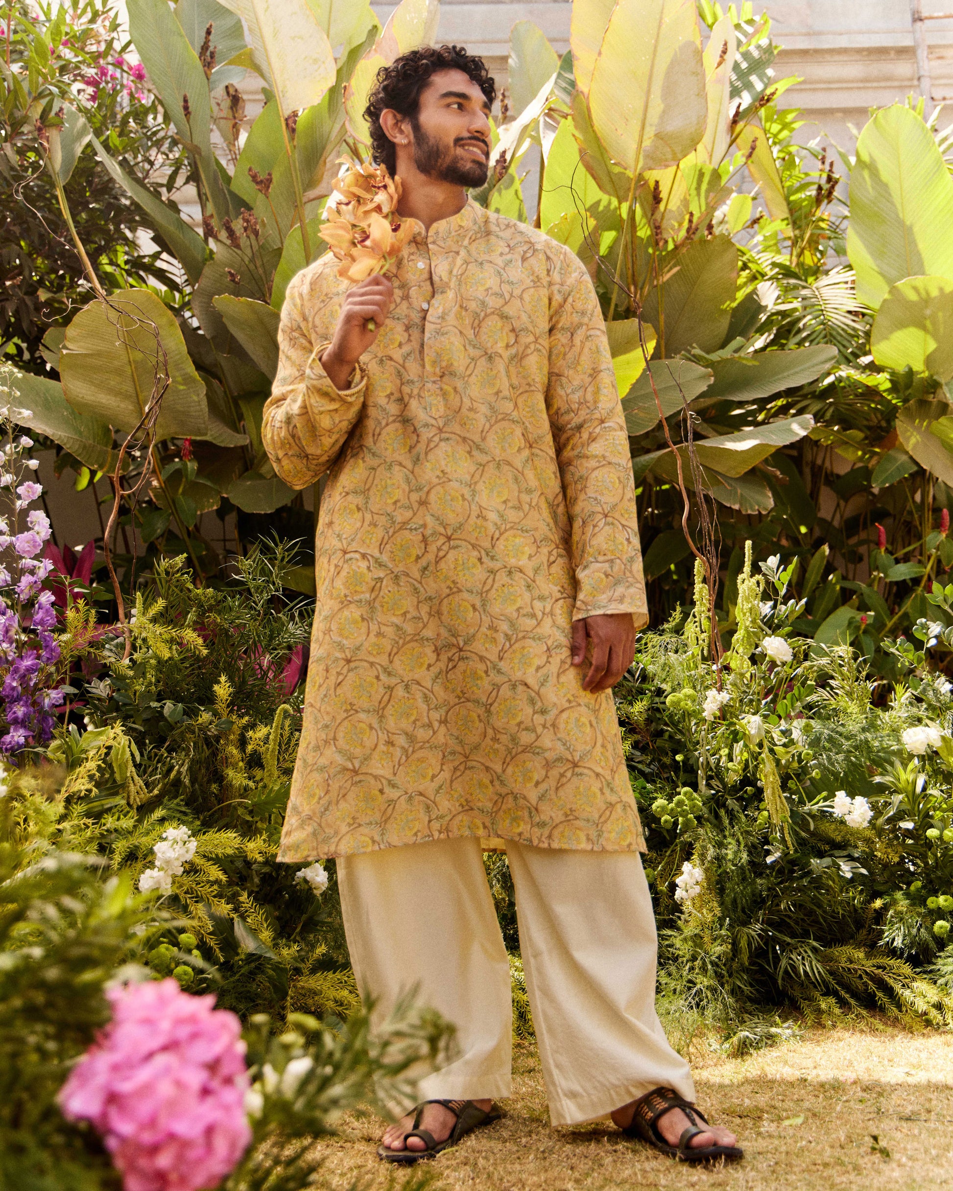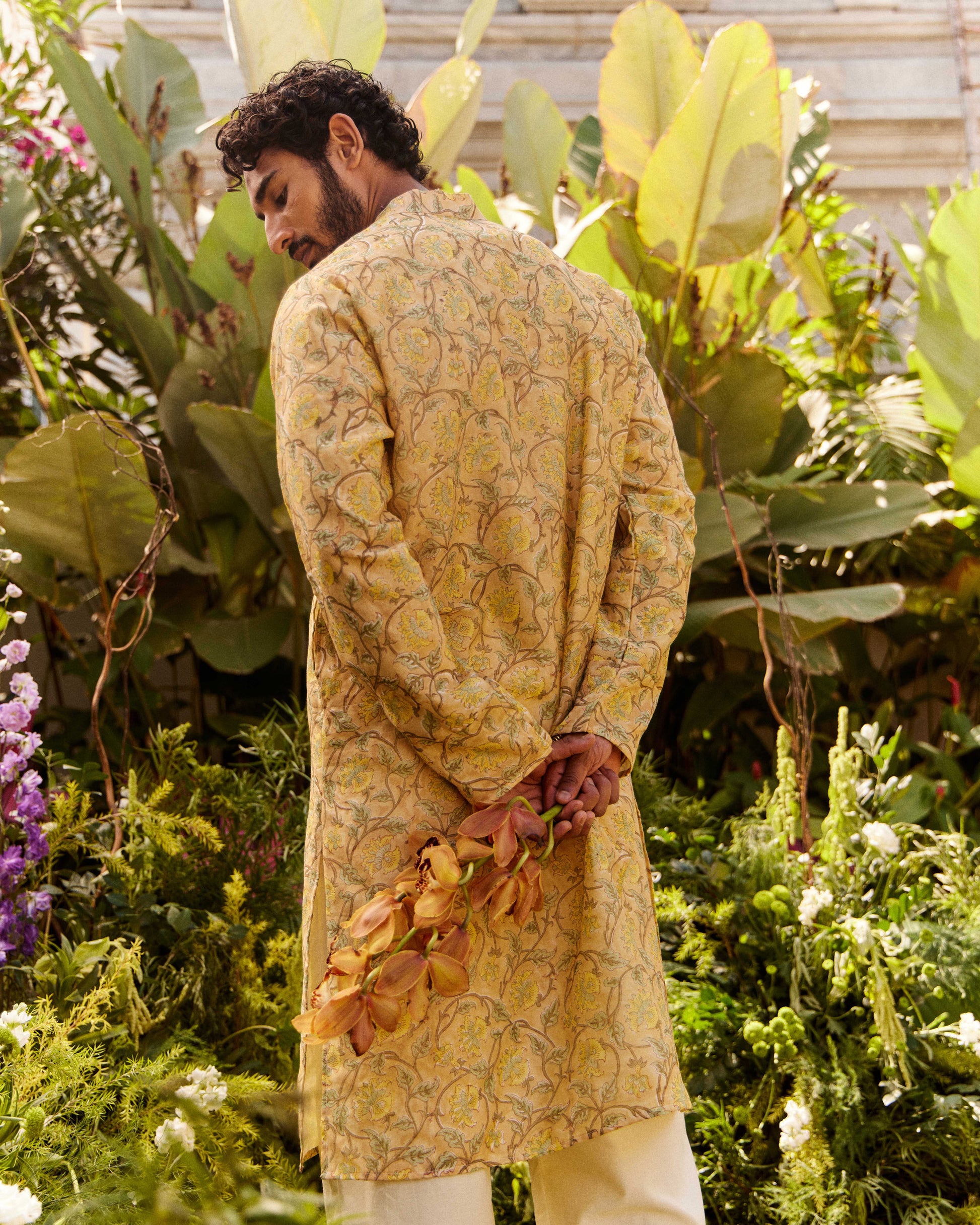 Chanderi handblock printed kurta with Mul cotton lining and regular placket.