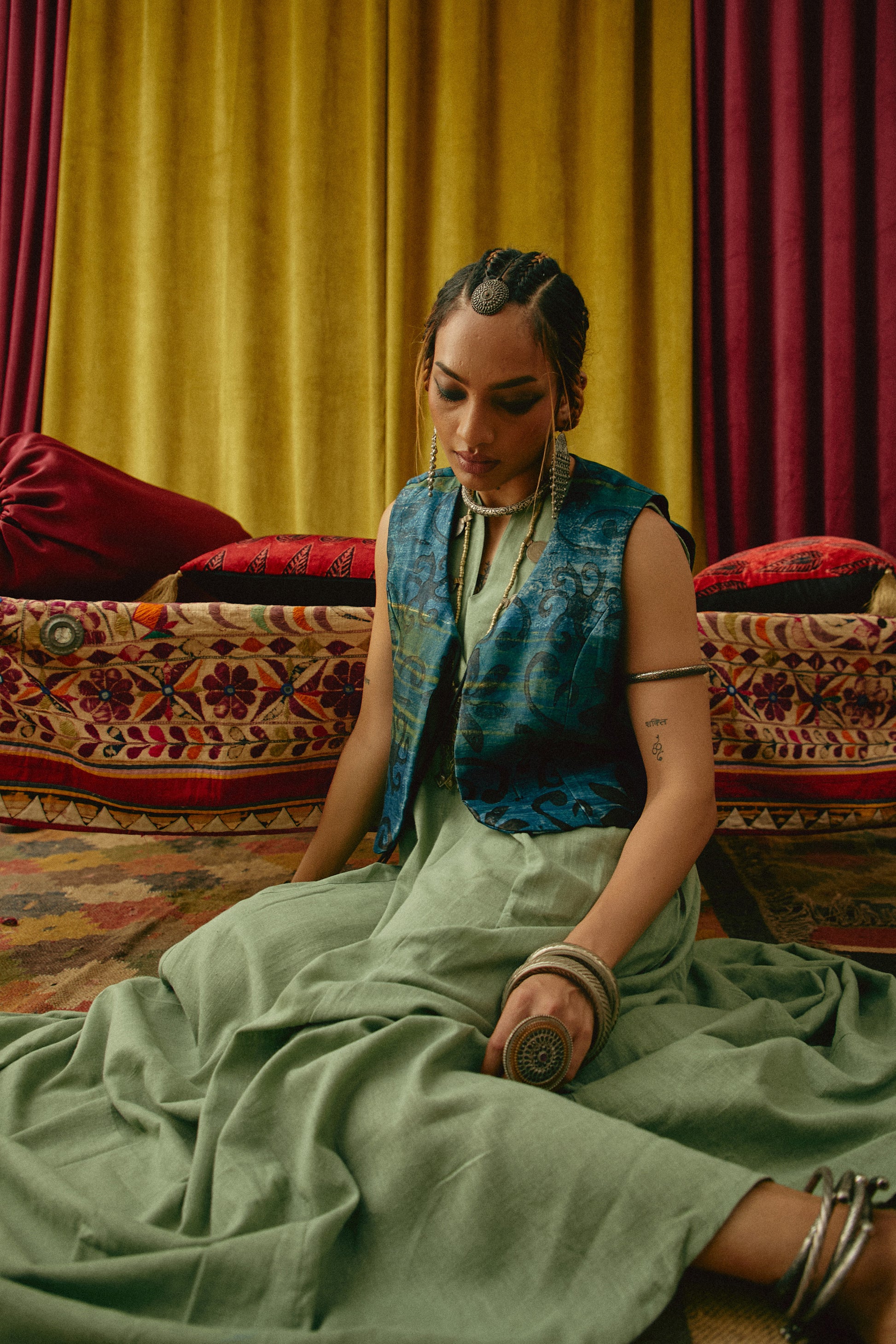 Fabric: Hand block printed Ajrakh on mashru fabric- Discharge Technique