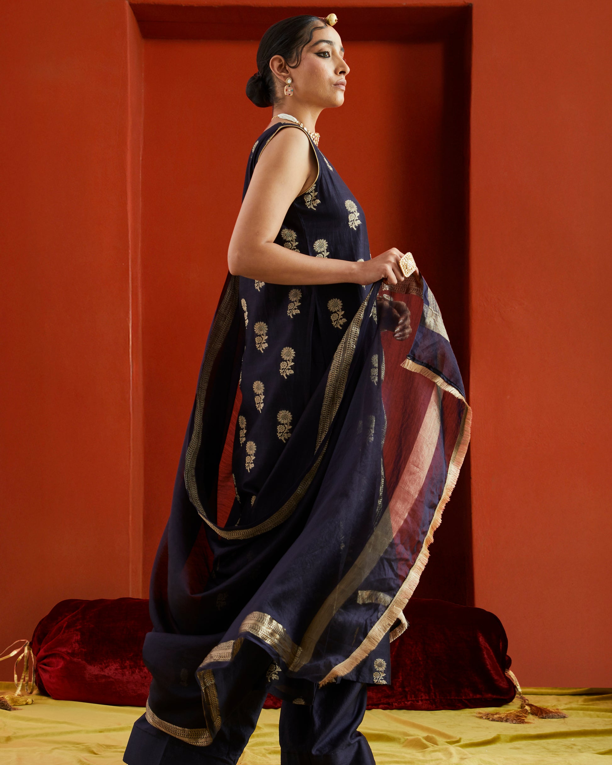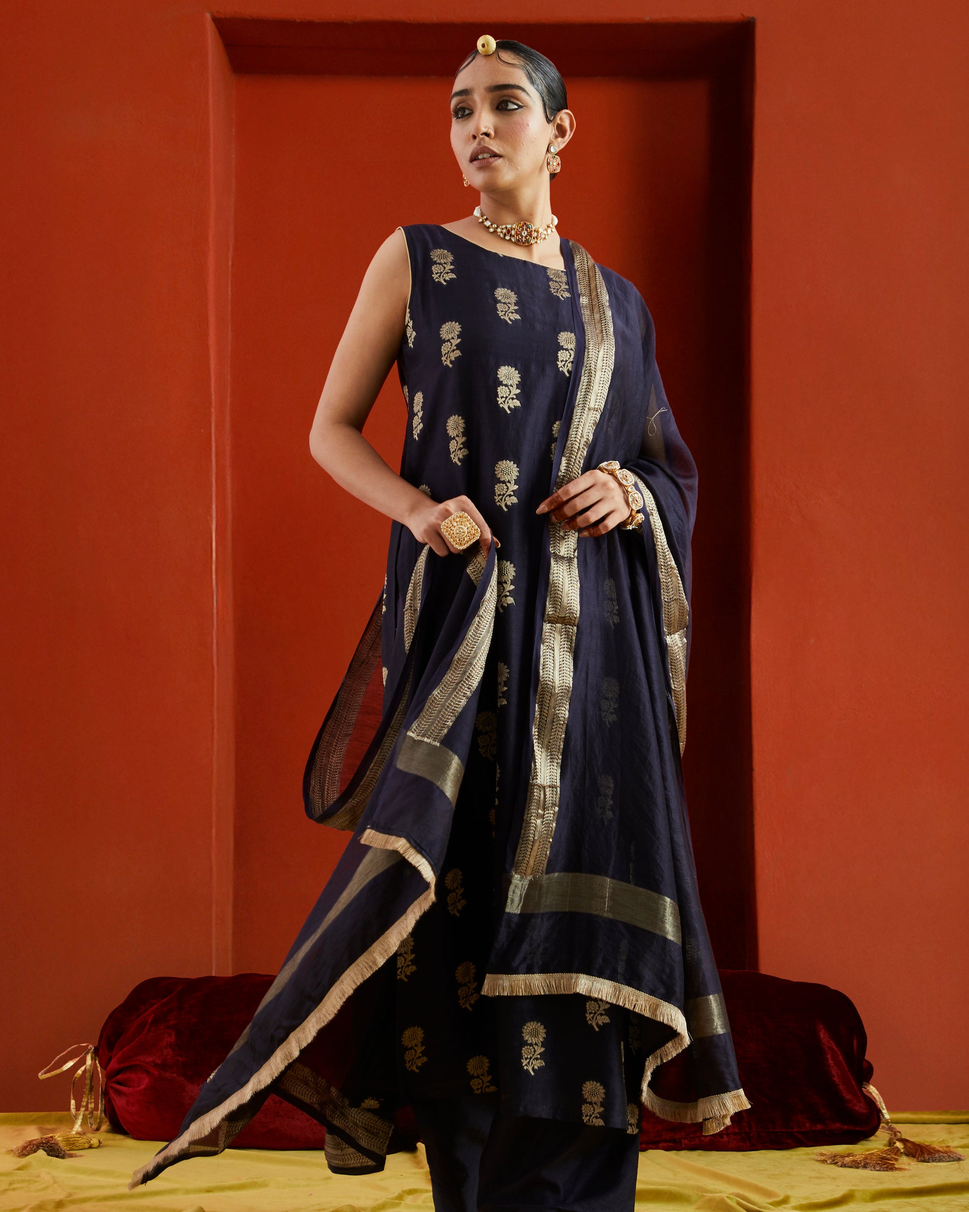 Midnight Blue Black Chanderi Dupatta With Gold Woven Border And Fringe Lace On Two Sides