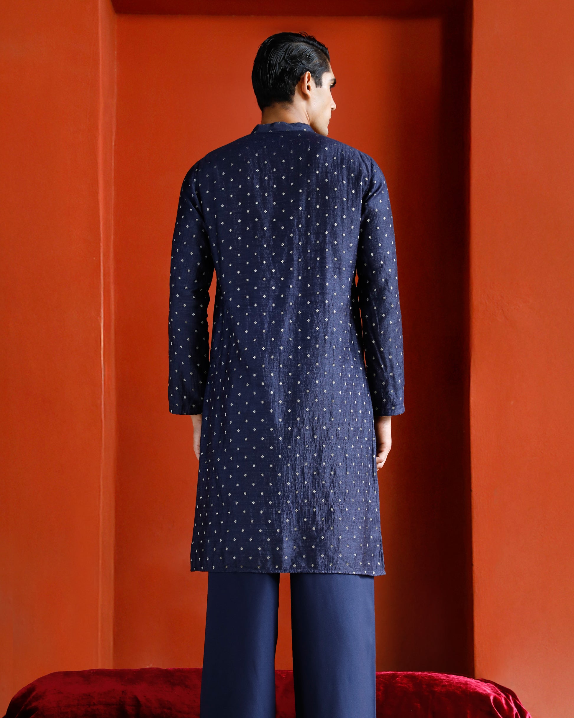 Midnight blue black Munga Silk Handwoven Buta Kurta with loop button placket and matching fabric buttons with cotton lining.