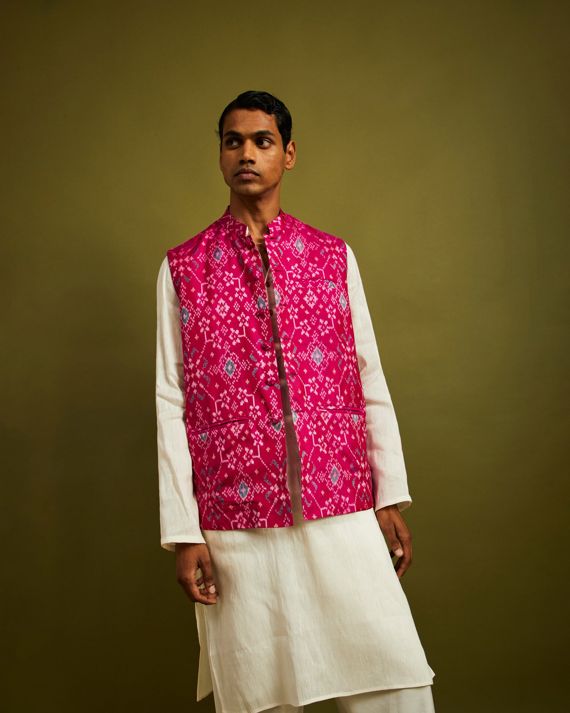 Patola Men's bandi/ waistcoat with a mandarin collar and pockets.