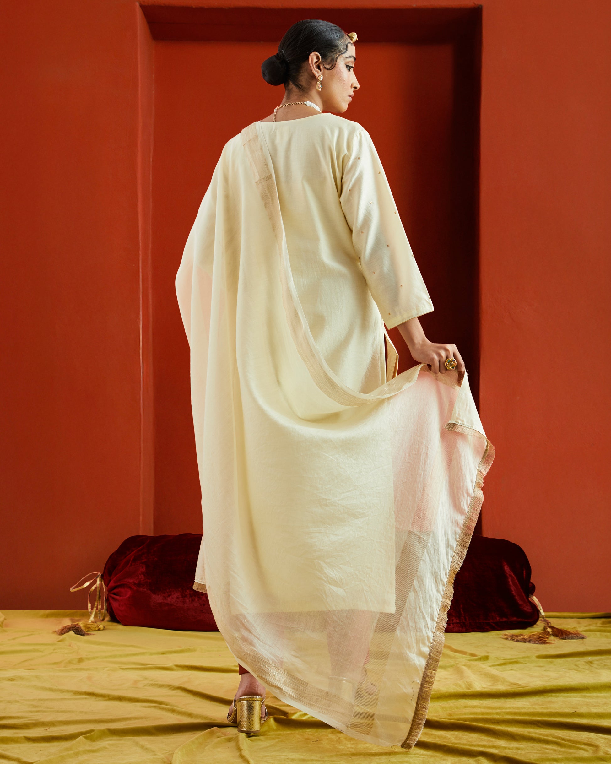 Off White Chanderi Dupatta With Gold Woven Border And Fringe Lace On Two Sides