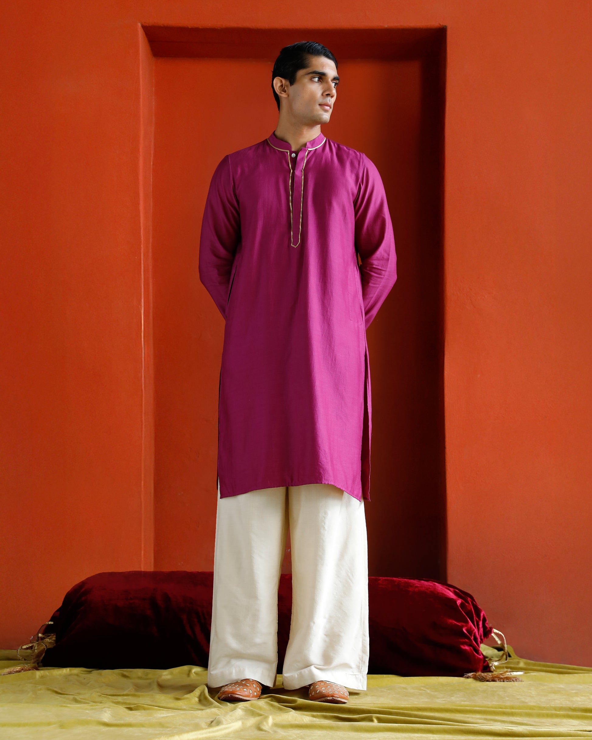 Chanderi Kurta with mandarin collar, gold placket piping, and cotton lining.