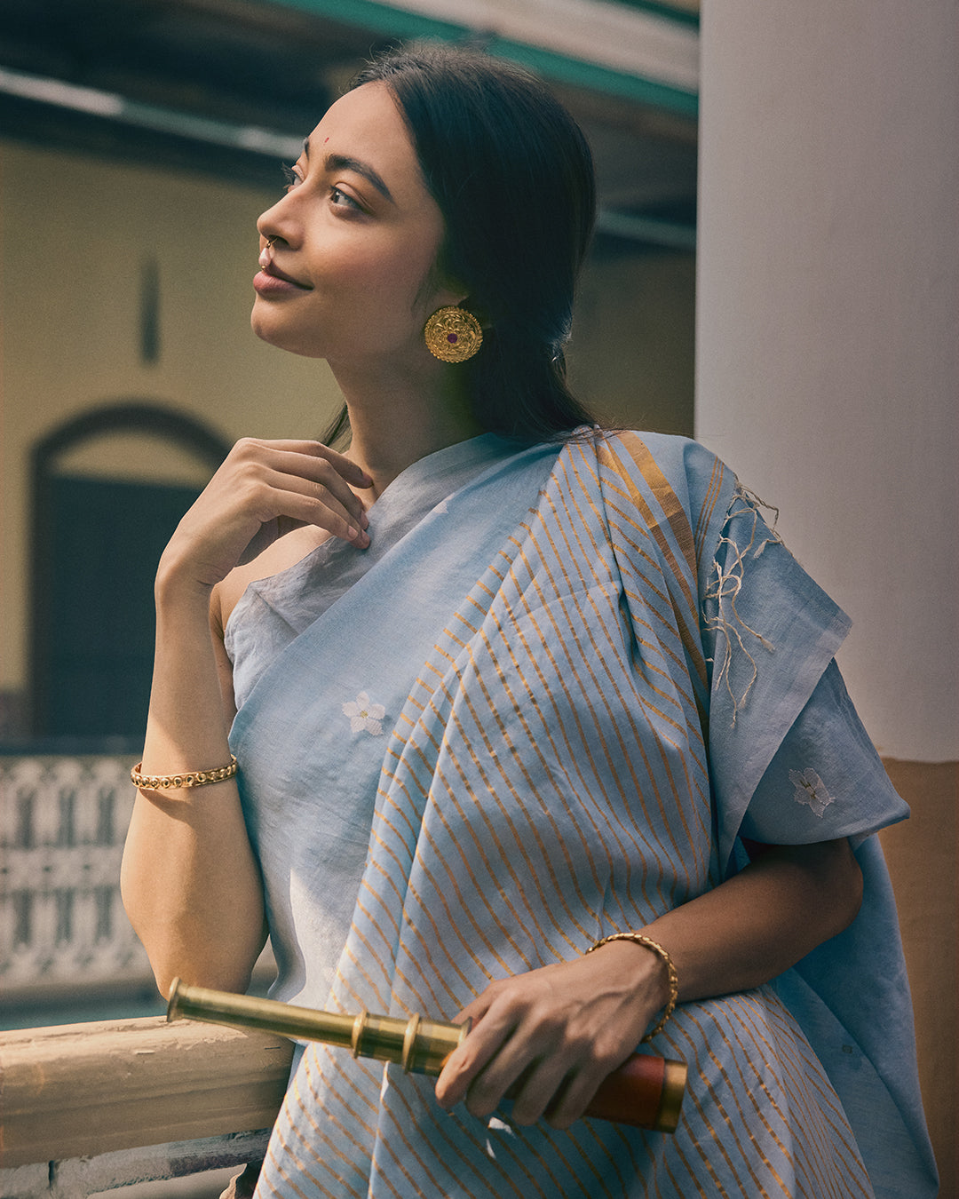 Dimensions : 5.5 mtr length | 45 inches width | Separate Blouse piece 1mtr. Fabric : Handwoven Cotton (100/2 mercerised) and Tussar Silk saree with Zari stripes and Cotton motifs. Saree woven by artisans in Bengal