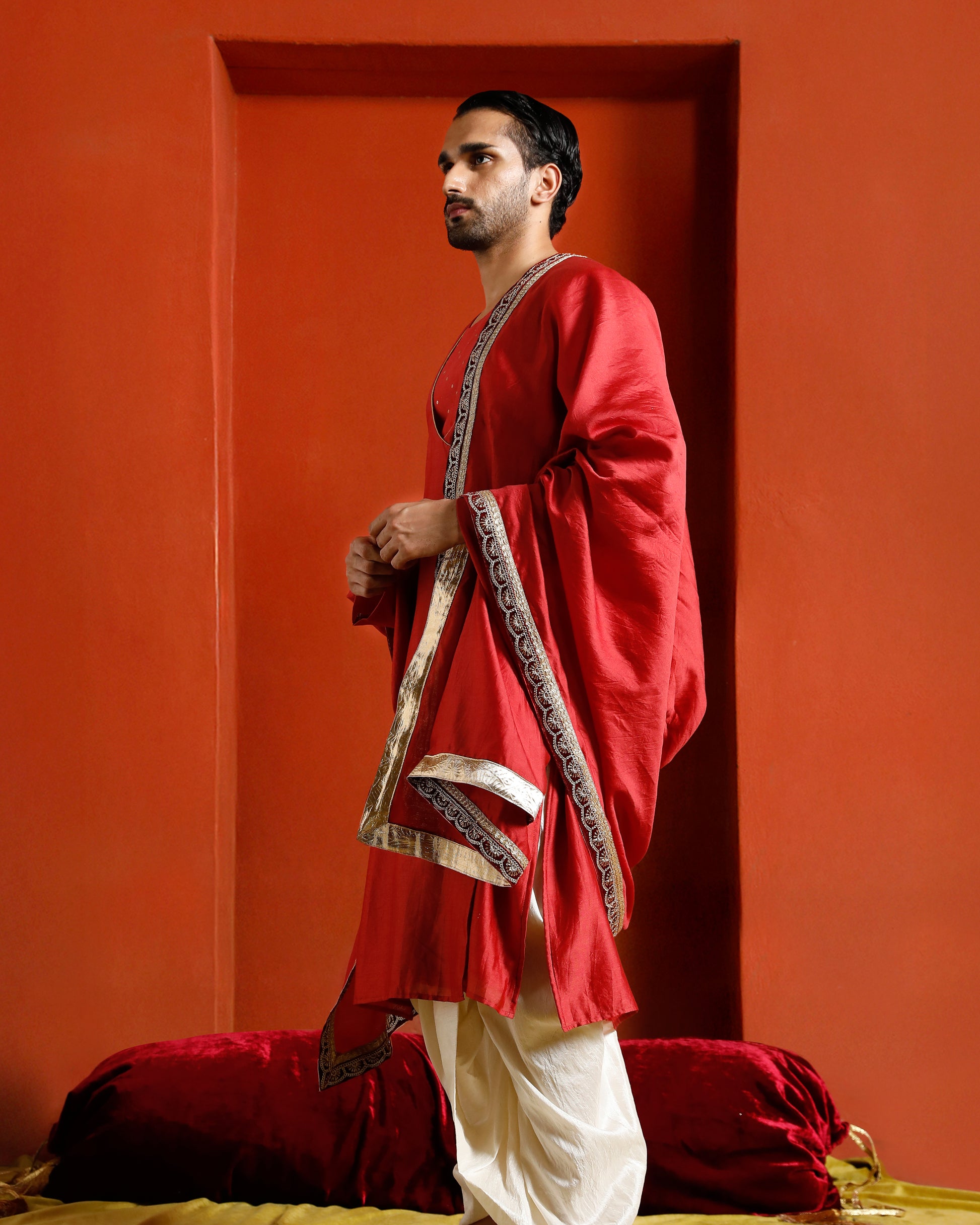 Red Pure Chanderi Lohi With Lace And Velvet Border