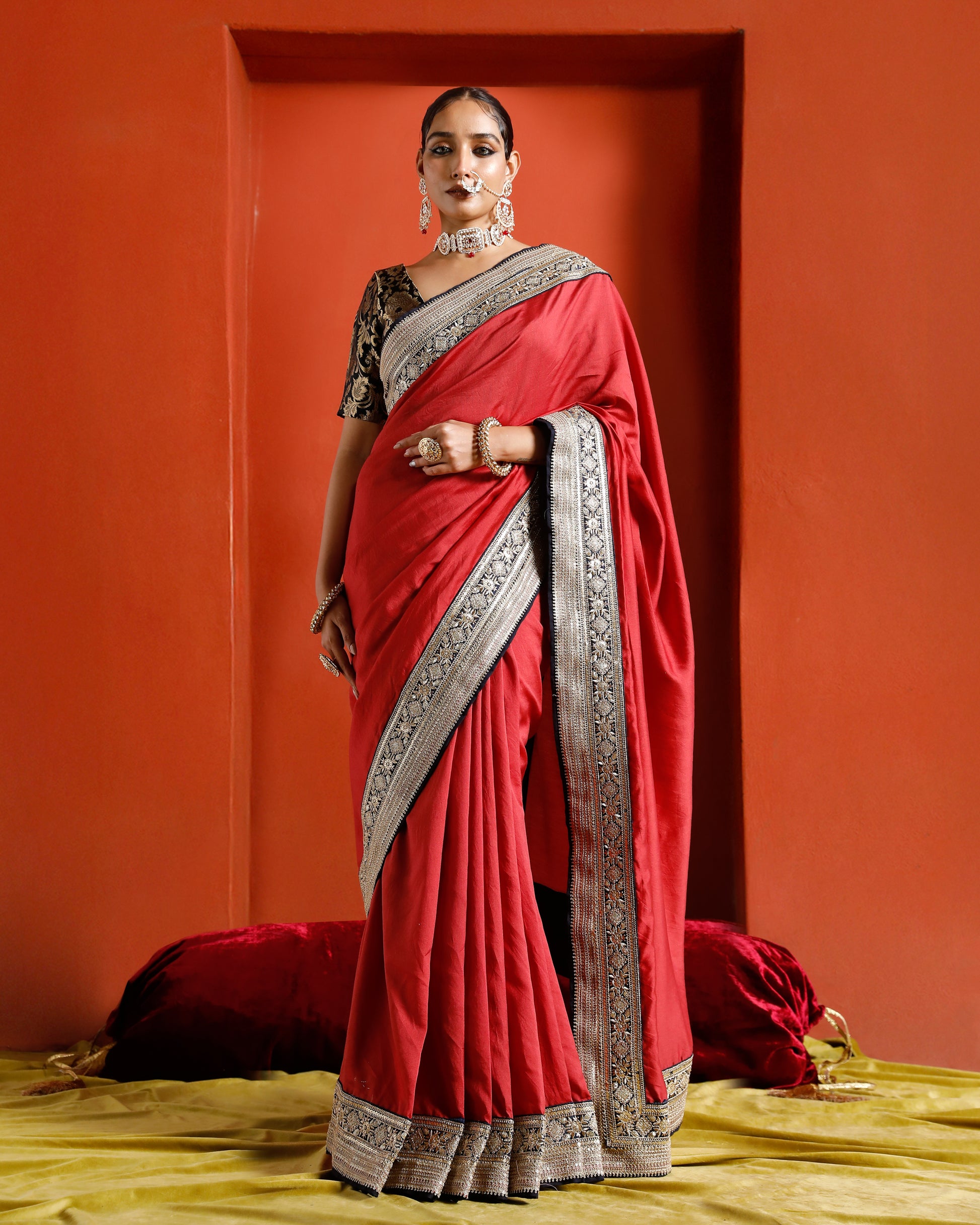 Red Pure Chanderi Saree With Black And Gold Border