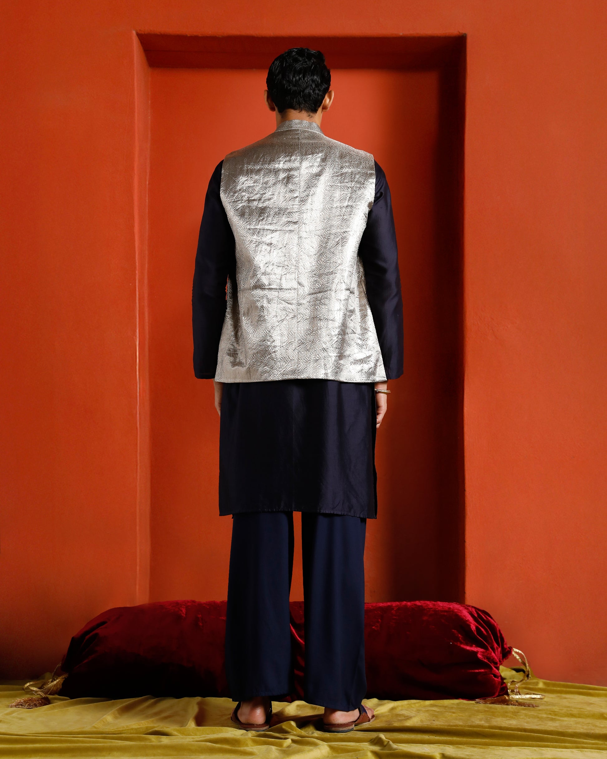 Tissue Brocade Men's bandi/ waistcoat with a mandarin collar, self fabric buttons and pockets.