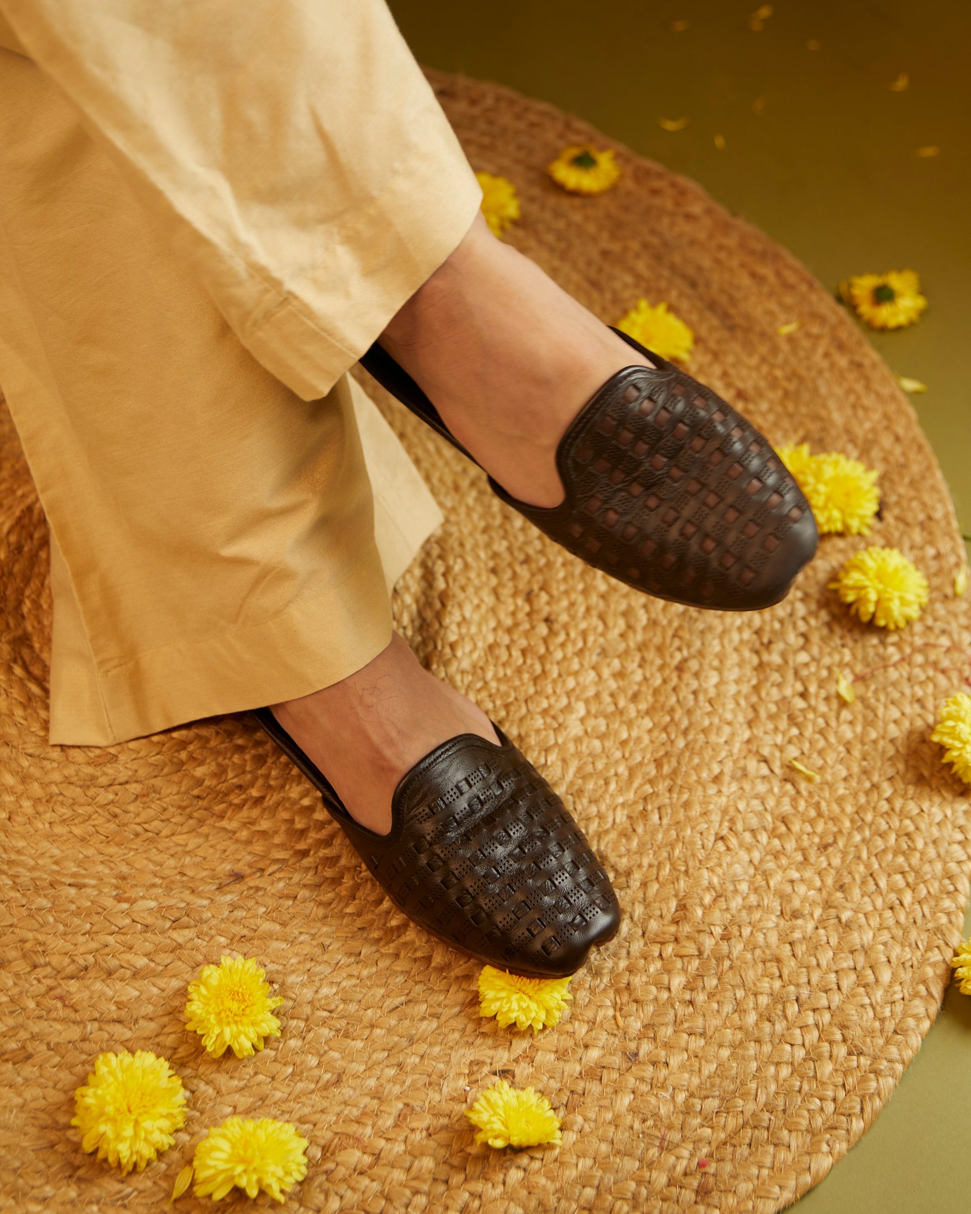Product Description: Handcrafted woven leather juttis.