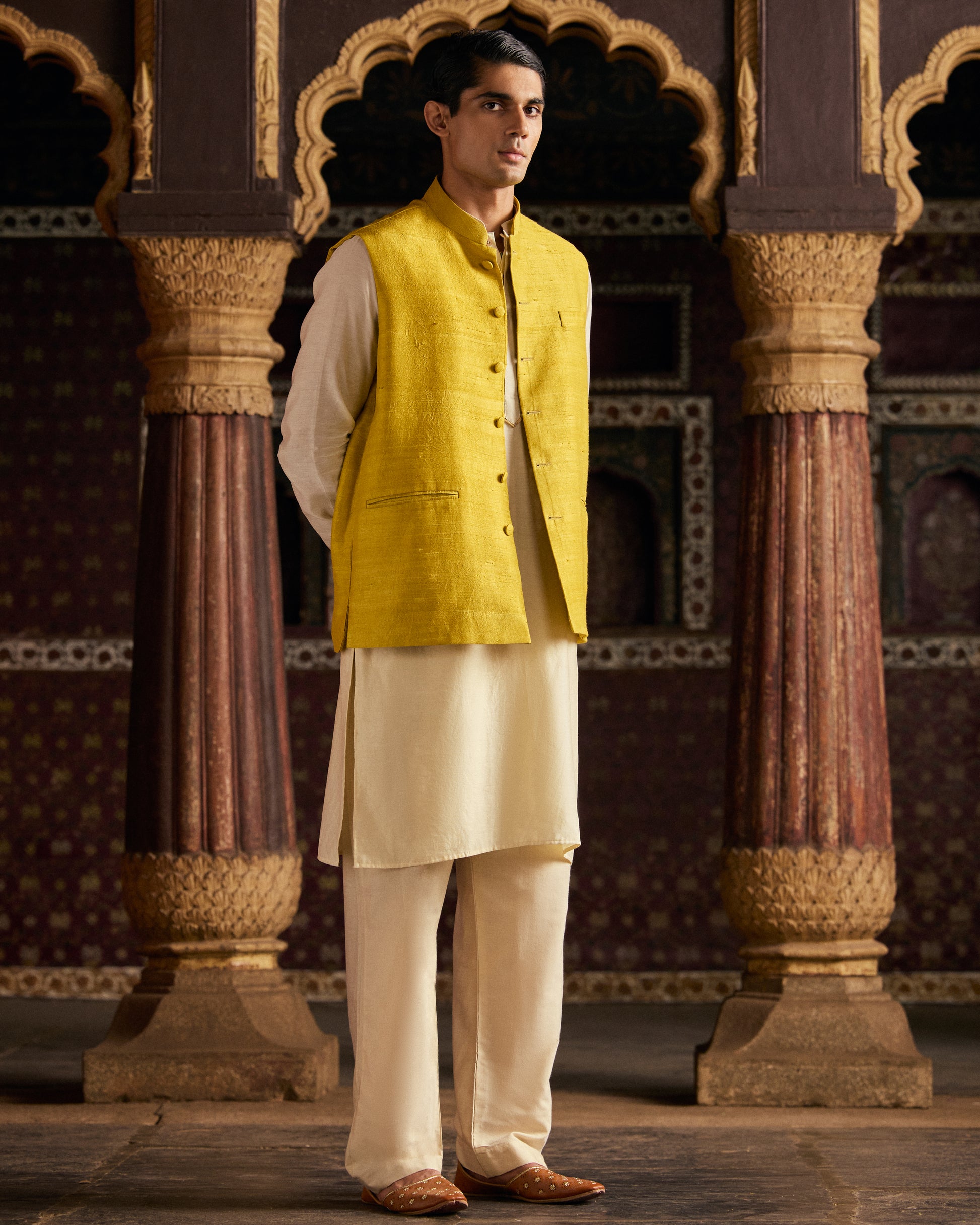 Raw Silk Men's bandi/ waistcoat with a mandarin collar, self fabric buttons and pockets.